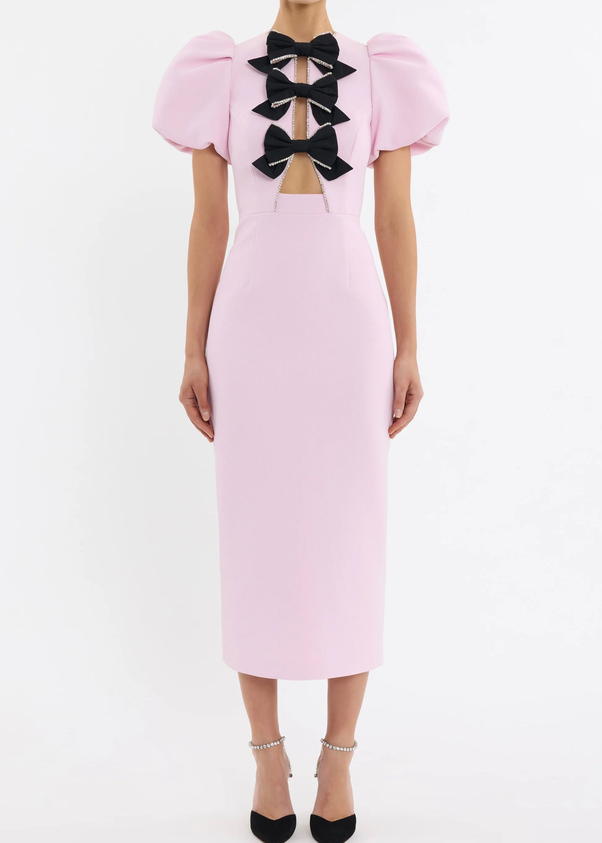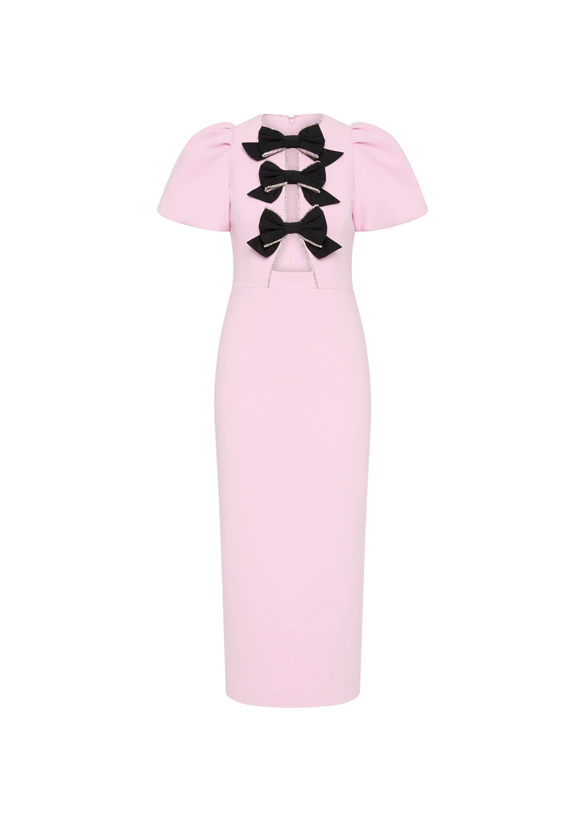 Elevate your style with the Nemy Midi Dress. Crafted from bonded crepe in a beautiful pink hue, this dress is adorned with delicate cut-outs and contrasting bow details featuring dazzling diamante embellishments. The fitted bodice and voluminous puff sleeves flatter the figure, while the sophisticated pencil midi skirt is finished with a back split for a touch of allure. Complete with a zip fastening and full lining, this dress is perfect for any special occasion