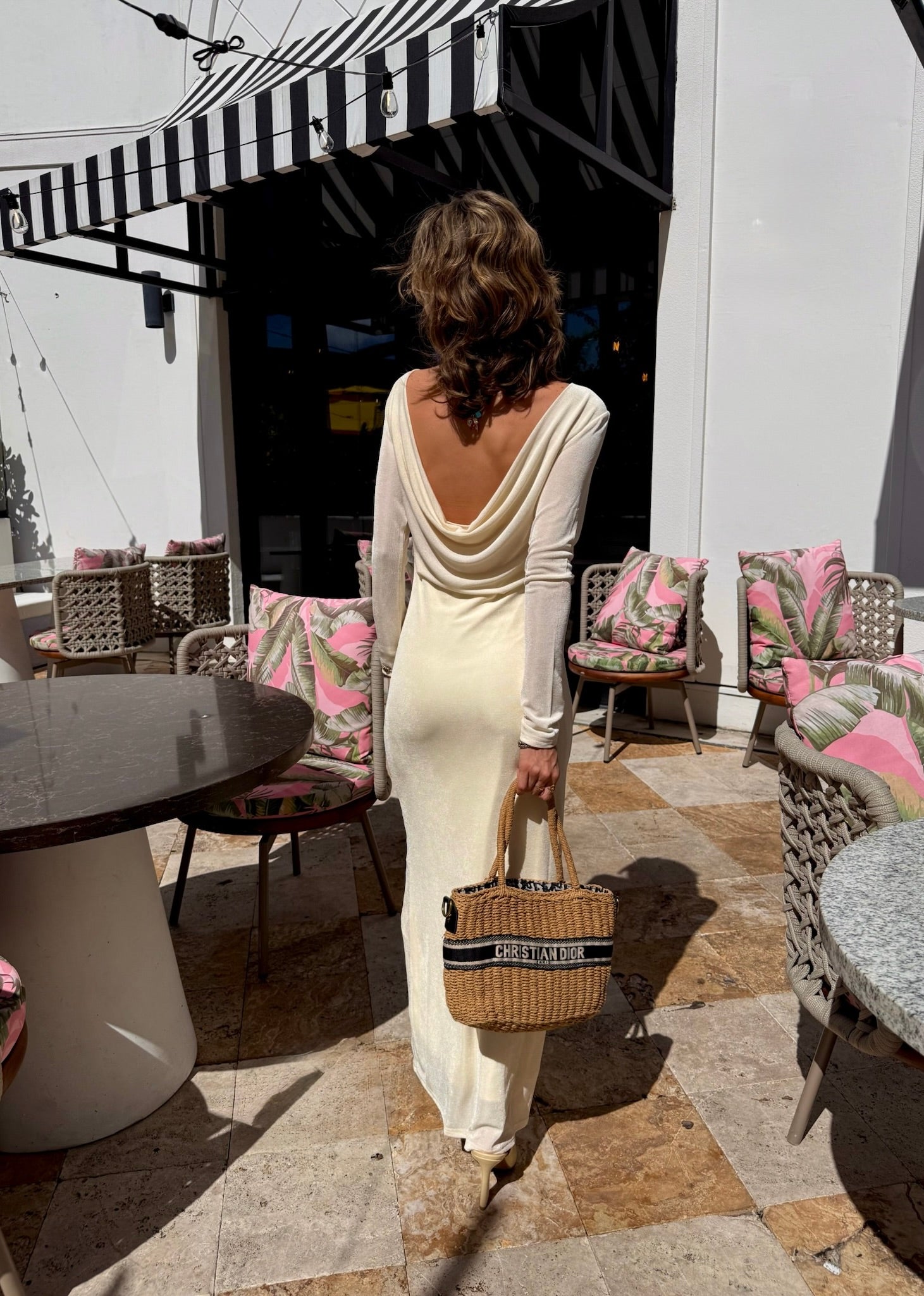 Experience the allure of the Moon Dress! This stunning pearl white maxi dress features long sleeves and a dramatic drop back, creating a mesmerizing silhouette. Elevate your wardrobe and make a statement with this elegant and versatile piece