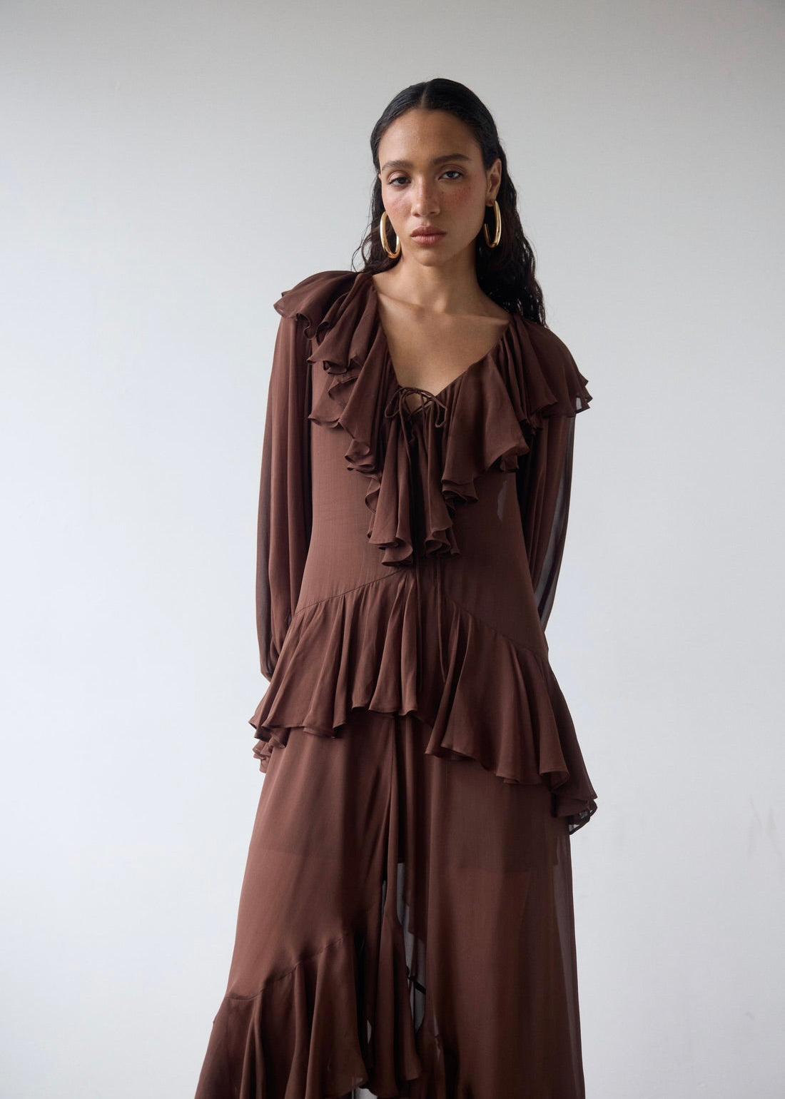 The Kona Maxi Dress brings a playful twist to elegance with oversized blouson ruffle sleeves tied with rouleau fastenings at the cuffs. Its ruffled V-neckline and hip details add flirty flair, while the billowing dipped hem and ruffle-trimmed skirt create enchanting movement. Crafted in a rich chocolate brown, this dress includes a removable slip for versatile wear—perfect for twirling through any occasion with carefree charm