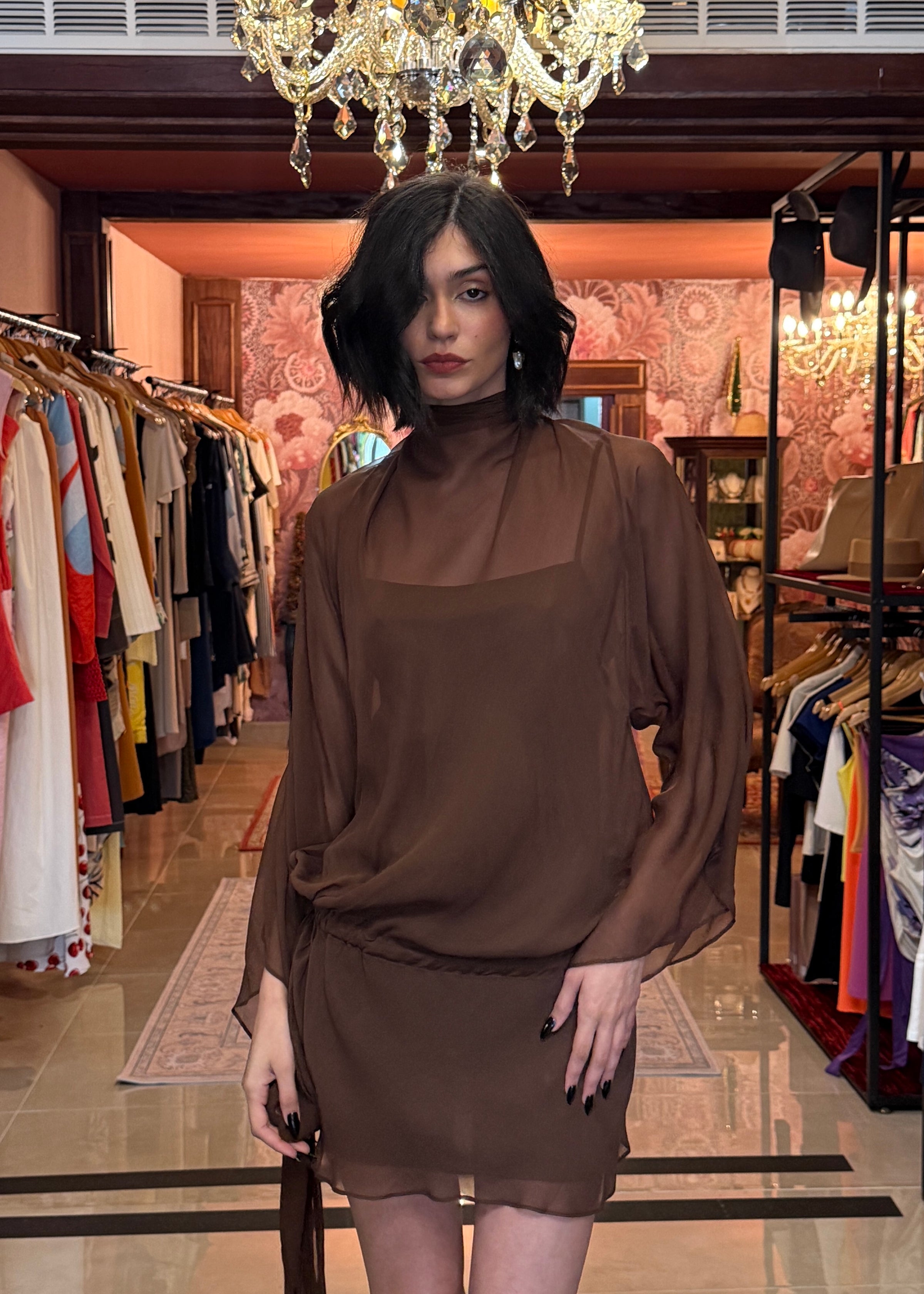 Step into playful elegance with the Bayamo Mini Dress in rich chocolate brown. Featuring flirty pagoda sleeves and a functioning tie waist, it perfectly balances structure and ease. The adjustable loose mini skirt offers effortless movement, while the detachable square neck mini slip adds versatile layering options. An asymmetrical tie neck completes the look with a charming twist, making this dress as dynamic and fun as you are