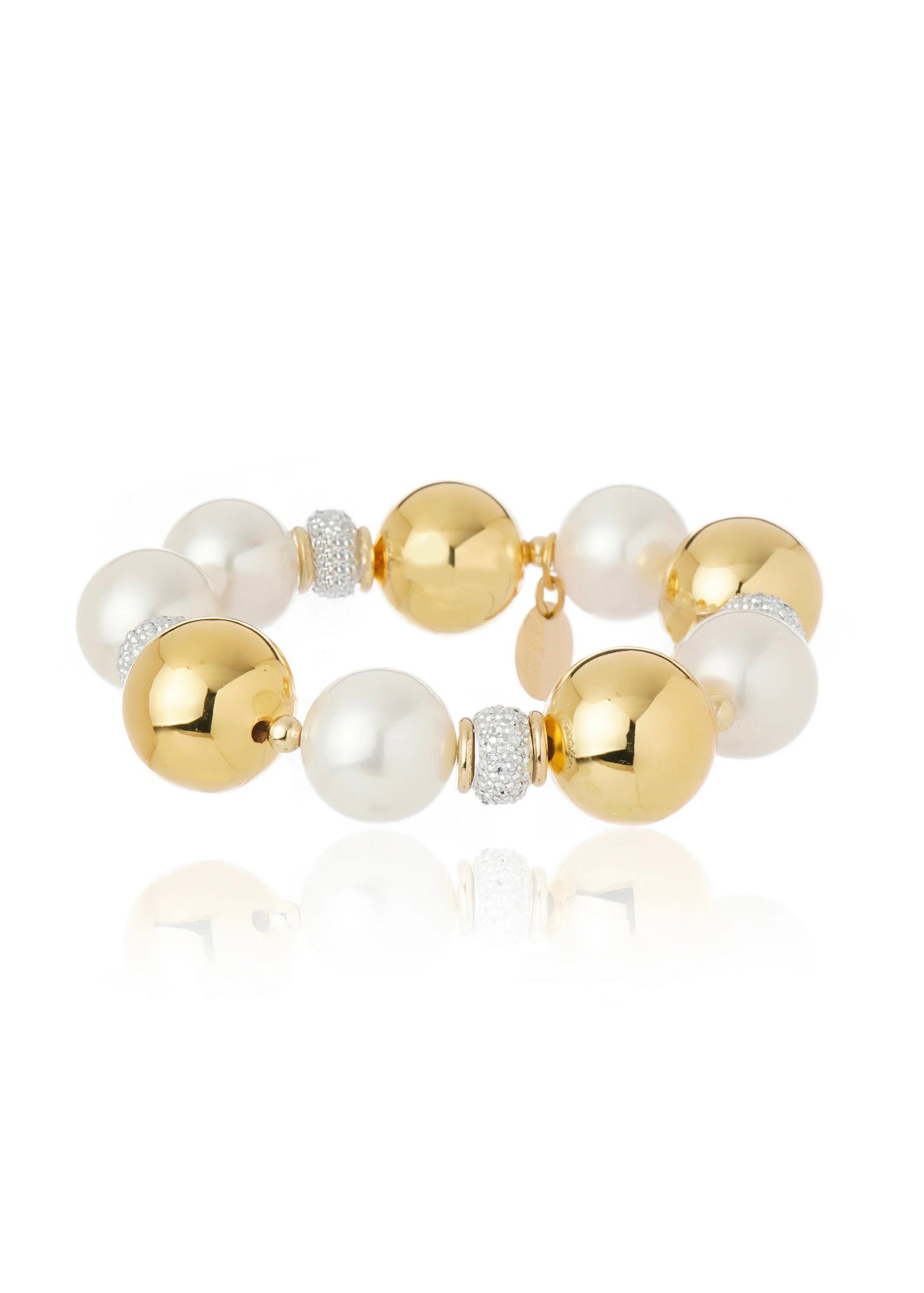 A bold statement from the Italian Glam '80 collection. The Perlato Trio Bracelet channels the extravagant elegance of the golden decade with three luminous rows of pearls, accented by high-shine gold-plated spheres and pavé crystal details Materials: gold platted brass...
