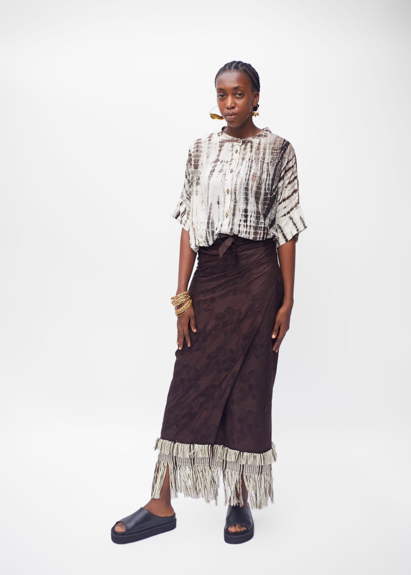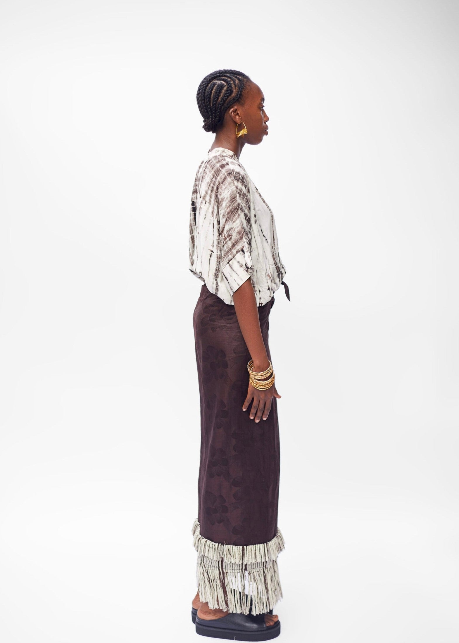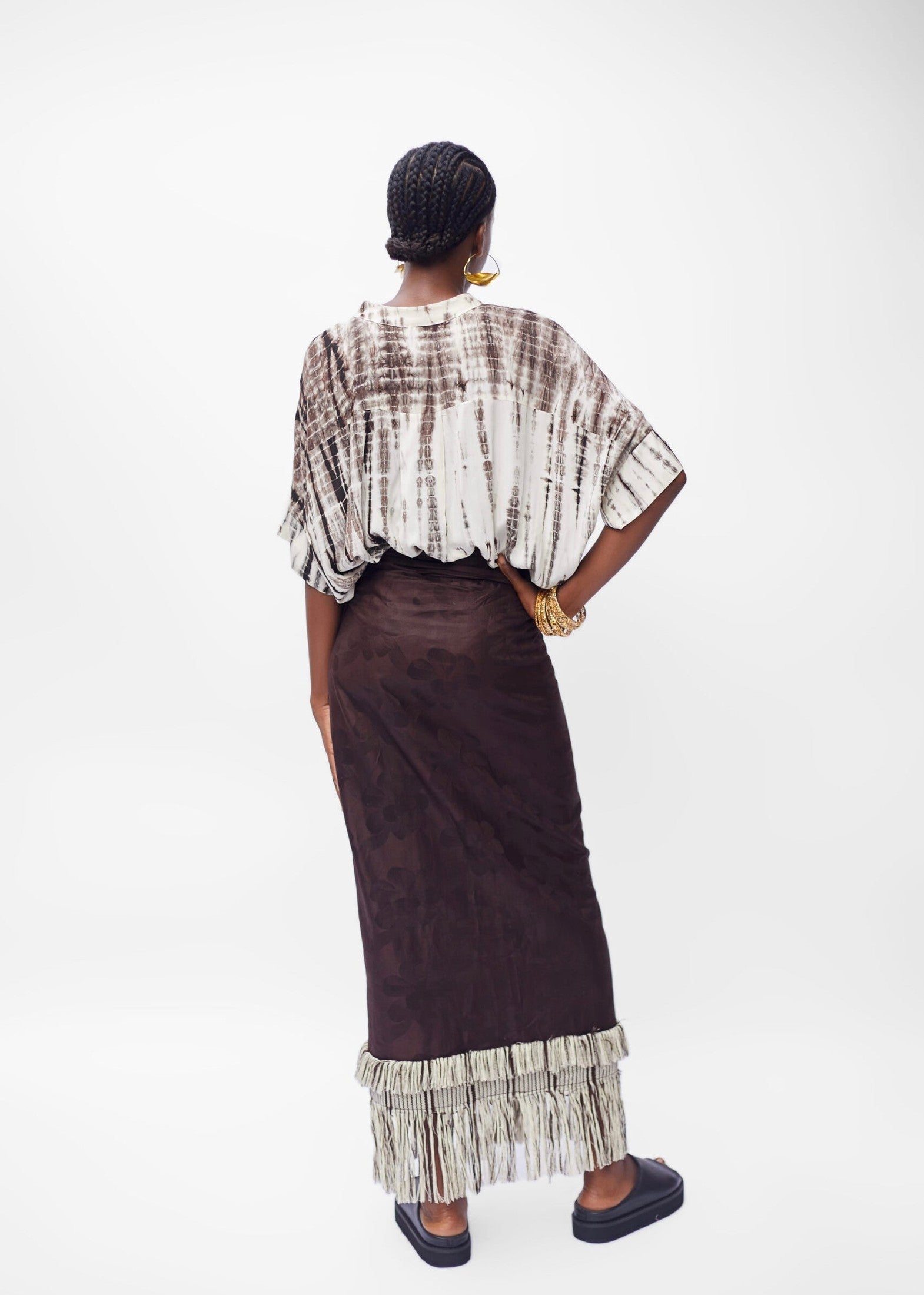 Elevate your wardrobe with our Marcos Top! This ivory and brown tie dye kimono blouse adds a touch of bohemian flair to any outfit. With its flowy, relaxed fit, you'll feel comfortable and stylish all day long. Perfect for those who appreciate effortless fashion with a unique twist