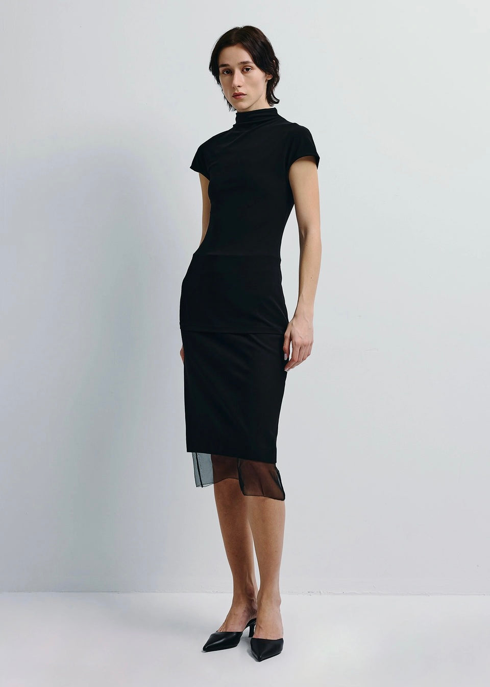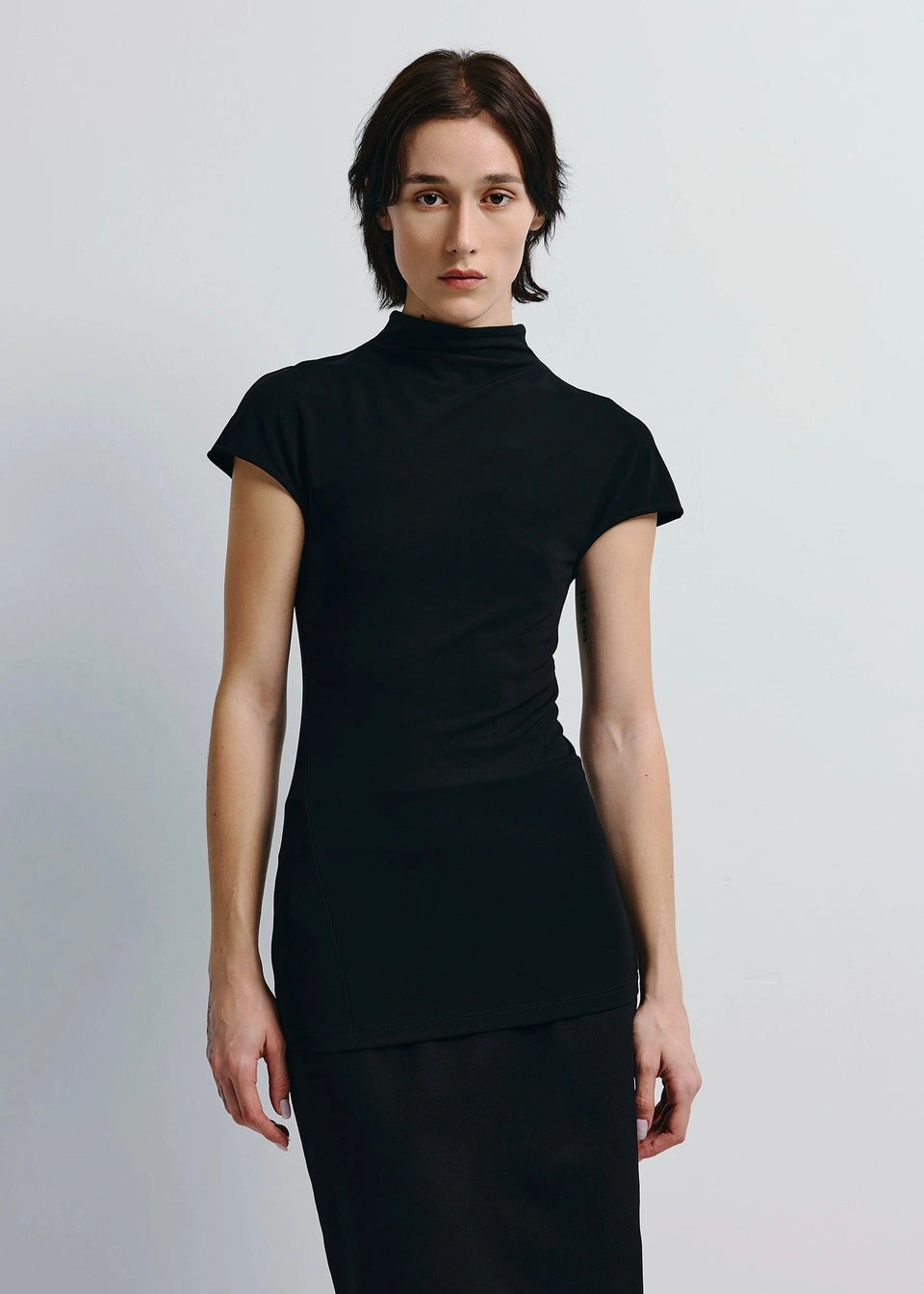 Bring a touch of sleek sophistication to your wardrobe with the Alini Top. Crafted from a silky black viscose-blend knit, it features a refined high neckline and playful short sleeves that balance elegance with ease. Perfect for those who want a modern, understated vibe with a smooth, flattering texture