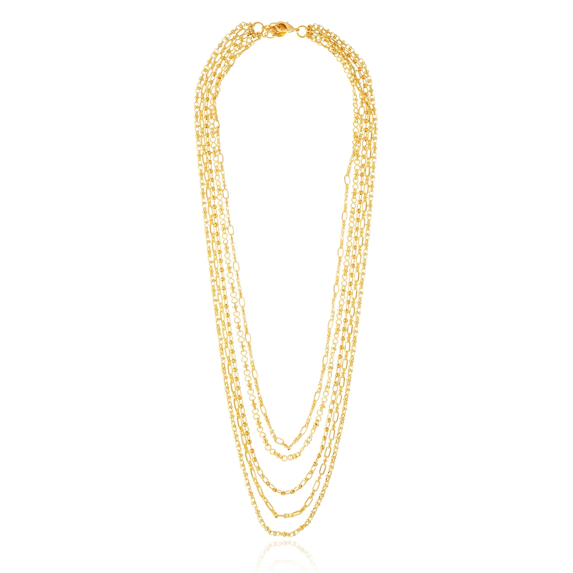Bold and luminous, the Barroco Rainbow Necklace is a celebration of joyful elegance. Crafted with layers of textured gold-plated chains, this statement piece evokes the richness of baroque style with a modern, radiant twist