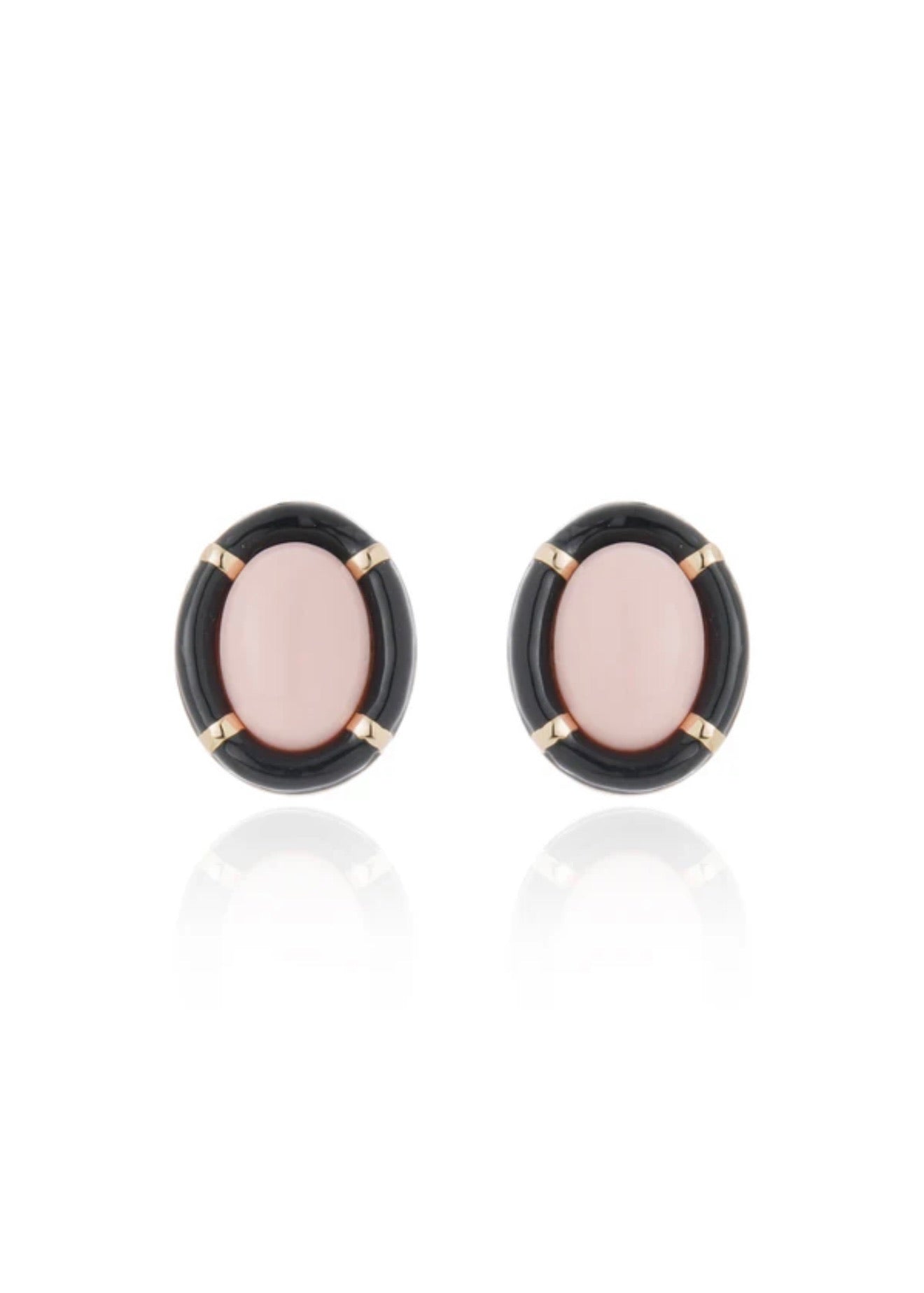 Refined and retro-chic, the Fascino Earring features soft blush pink cabochons set in glossy black resin and framed by subtle gold accents. With its clean oval silhouette and timeless palette, this piece adds a polished finish to both casual and dressy looks