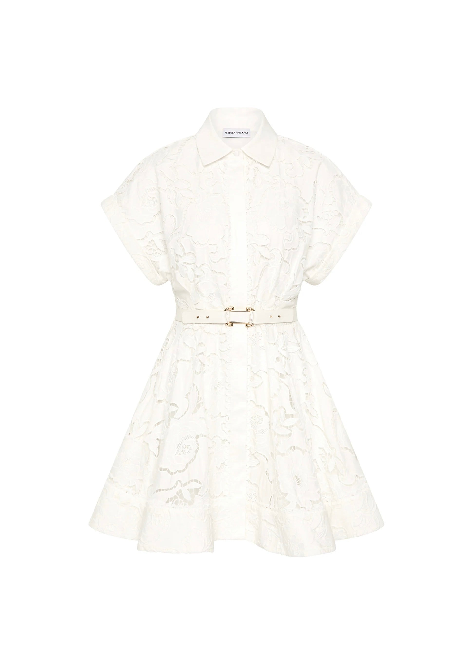 The Ginger Mini Dress in ivory brings playful charm to your wardrobe with its delicate broderie anglaise fabric. This flirty shirt dress features a PU belt with gold accents that cinches the waist, highlighting the fun, circular mini skirt. With grown-on sleeves, a sleek stand collar, and pretty lace scallop trim, it’s the perfect mix of sweet and sophisticated for any occasion