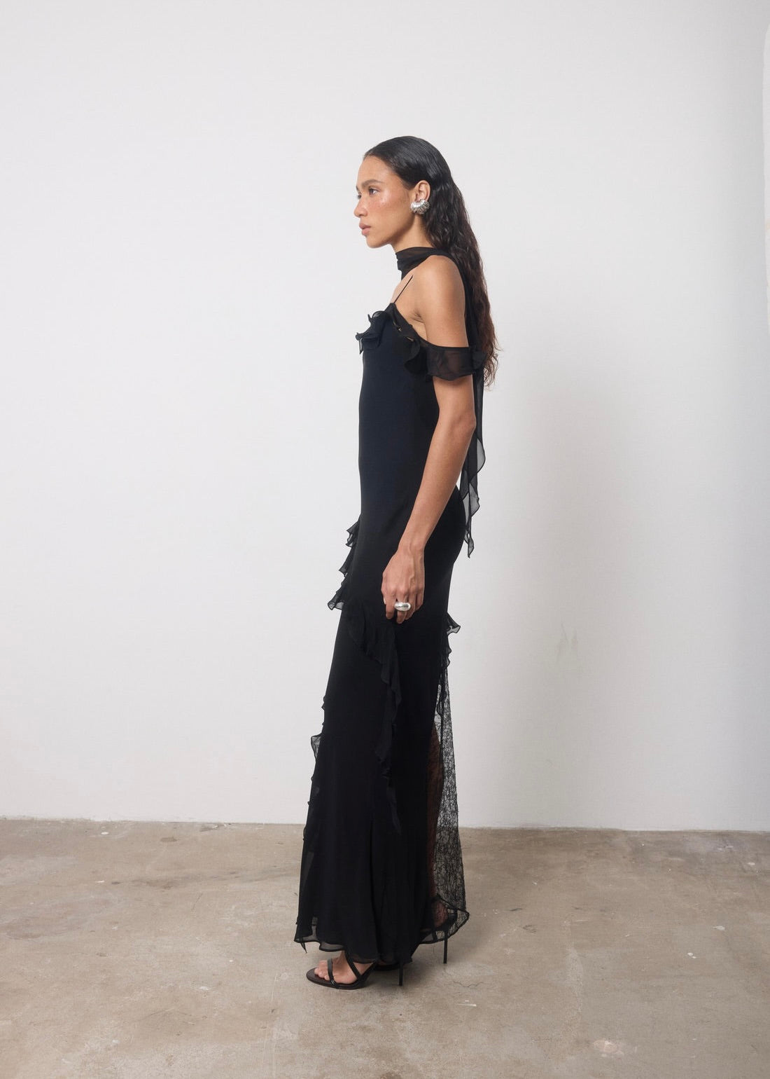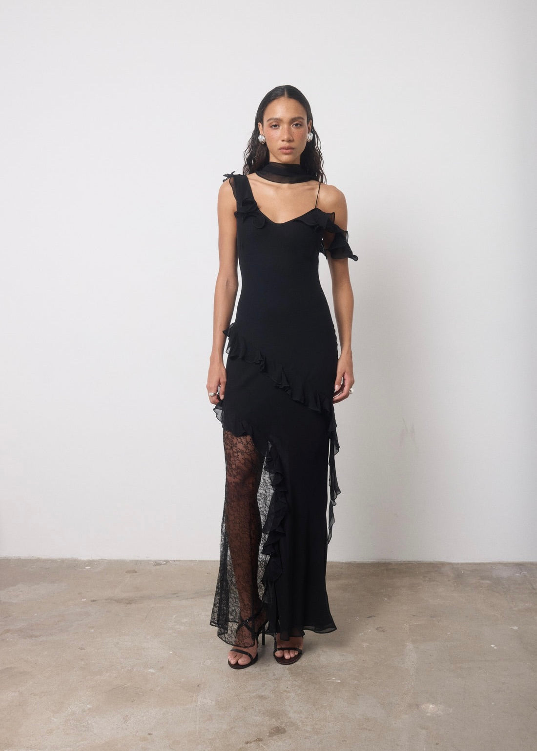 Step into effortless charm with the Leste Maxi Dress. This black bias-cut silhouette features playful ruffle detailing and a wire frill accent on the bust that adds shape and whimsy. Delicate lace inserts in the skirt bring a hint of romance, while the detachable scarf lets you customize your look. Fully lined for comfort, the adjustable sleeve ruffles let you tailor the vibe from flirty to