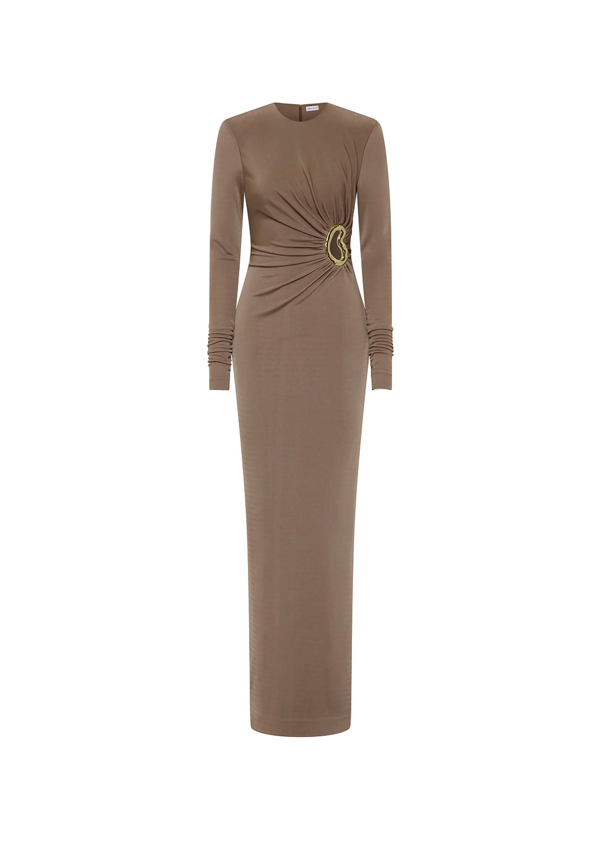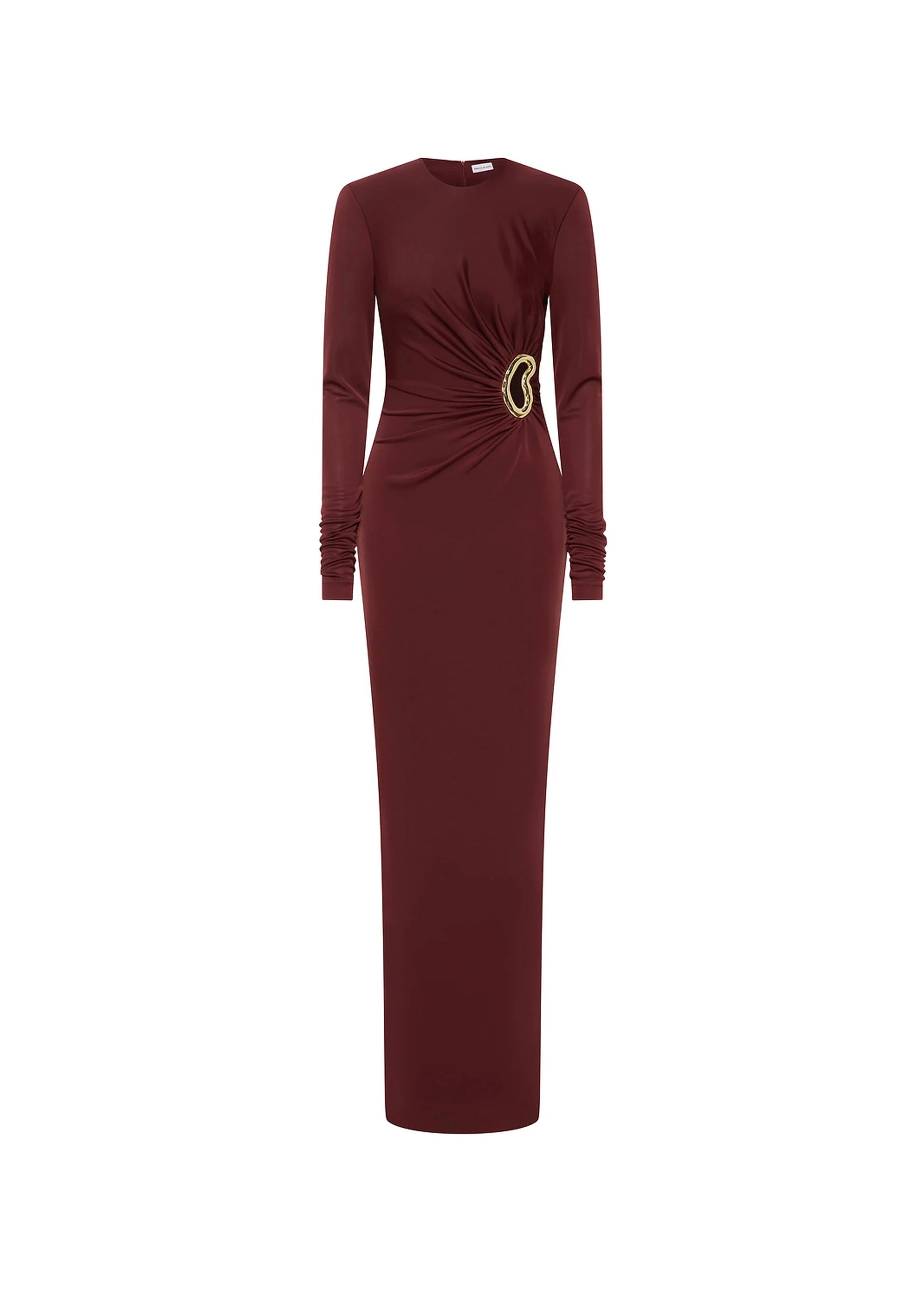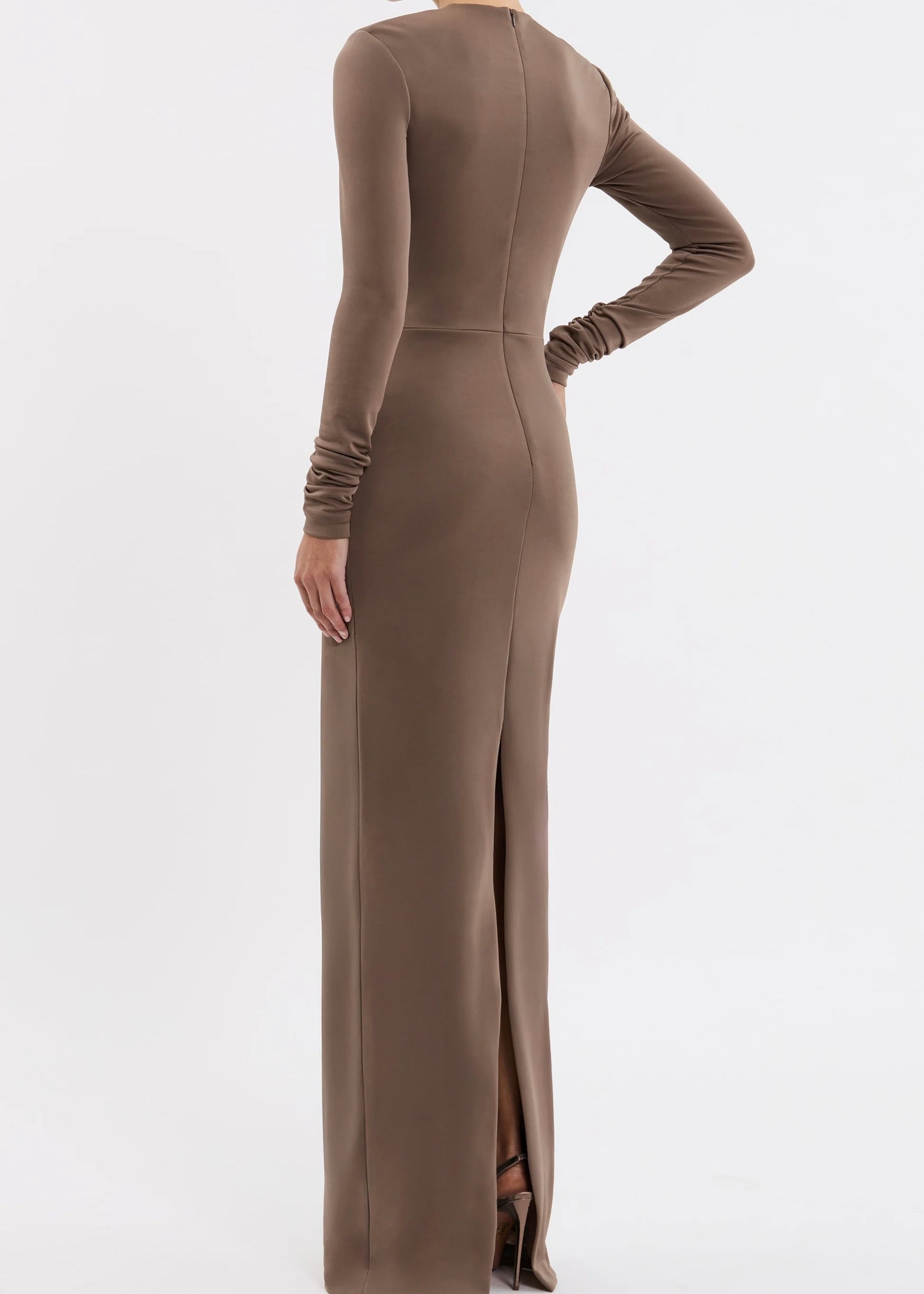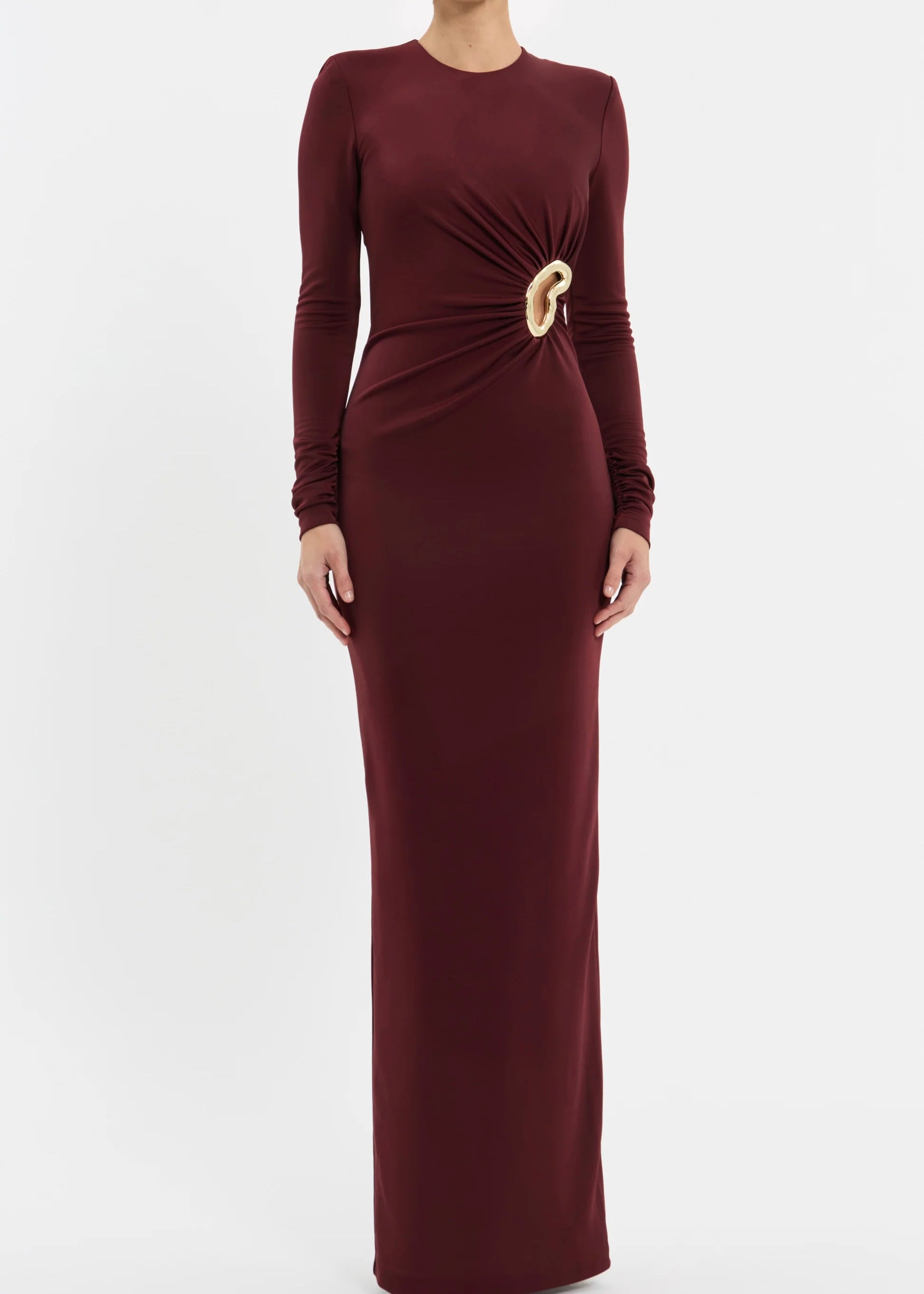 Step into bold elegance with the Mischa Maxi Dress, available in warm mocha or rich wine. Crafted from soft premium jersey, it hugs you with a sleek silhouette and playful gathered long sleeves. The structured shoulders give just the right amount of edge, while a cheeky side cut-out with gold hardware adds a splash of glam. Flow effortlessly in the maxi column skirt featuring a flirty back split. With an invisible back zip, this dress is your go-to for turning heads with style and confidence