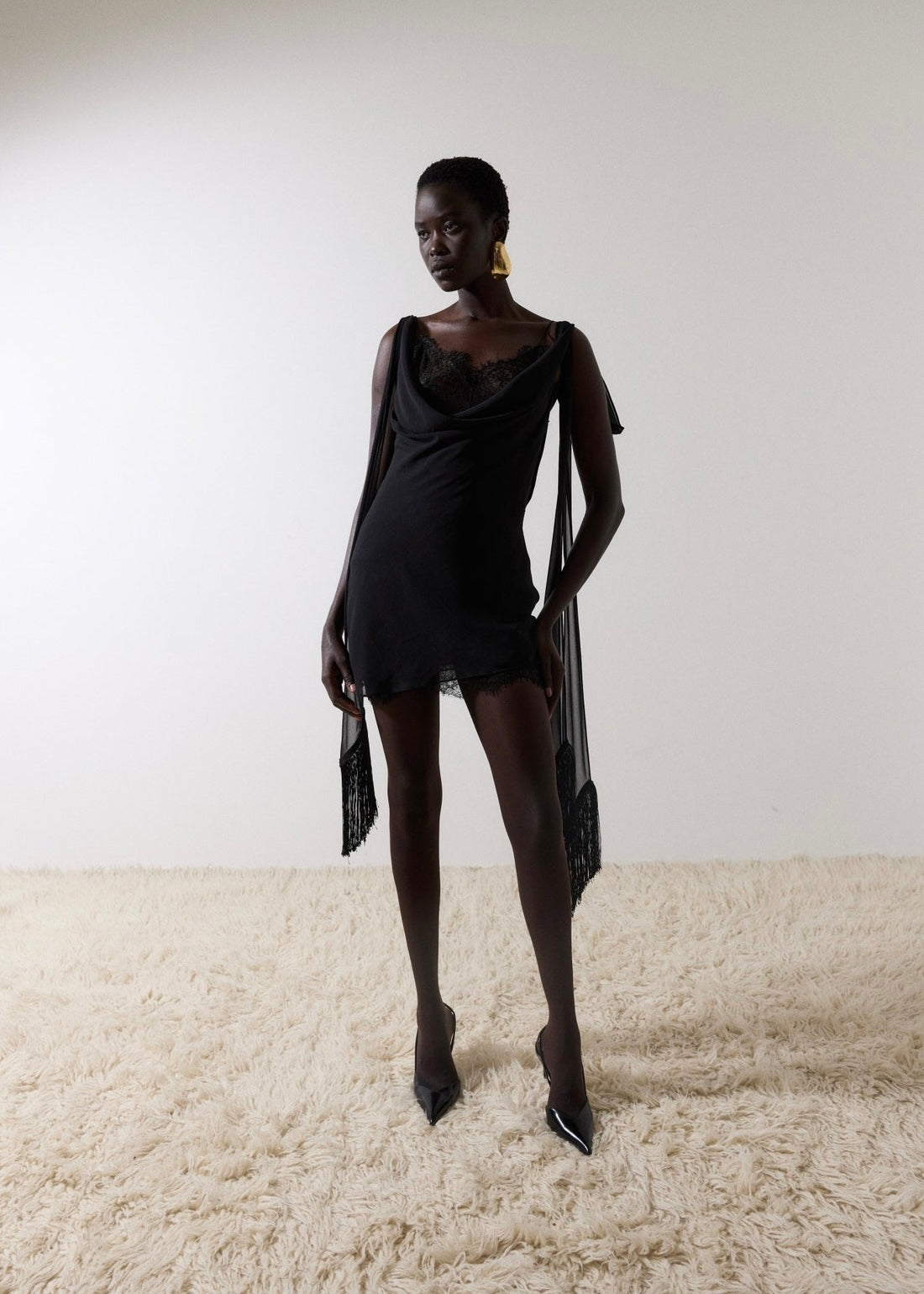 Unleash your individuality with the Mistral Mini Dress! This stunning asymmetric piece features a draped cowl neck and a tie shoulder detail adorned with a chic fringe hem. The detachable fringe hem scarf and lace mini add versatility, allowing you to create your perfect look for any occasion. Stand out and inspire!