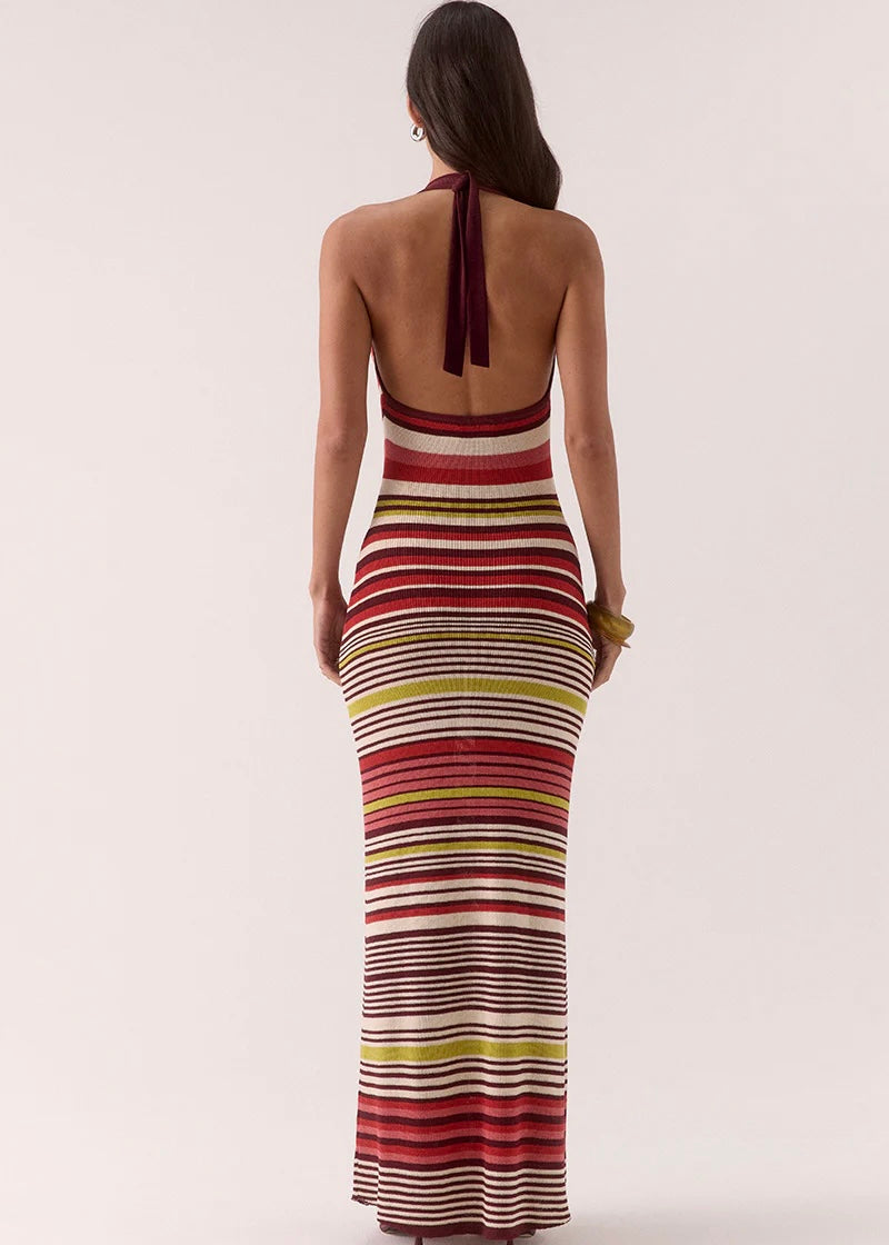 Introducing the Pandora Dress, a must-have for the fashion-forward. This halter maxi dress features a feminine drape front and is made from a soft knit fabric in beautiful pinkish tones. Perfect for any occasion, this dress will have you feeling confident and stylish