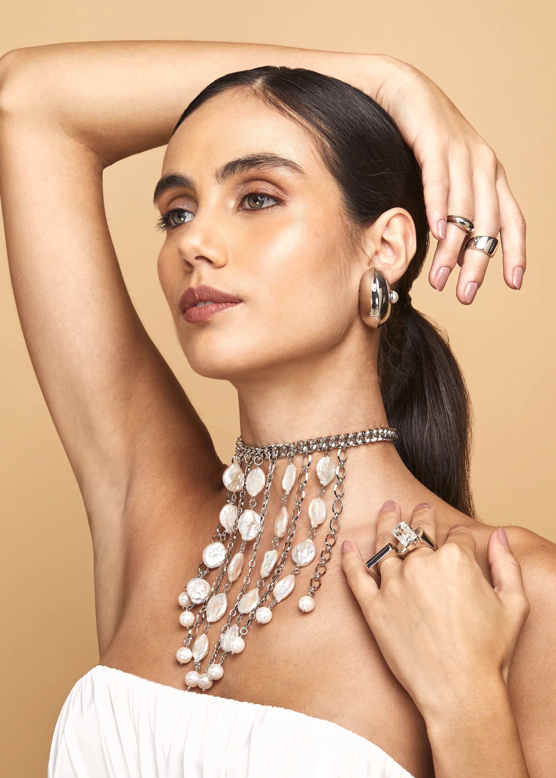 The Quinn Necklace combines timeless elegance with modern sophistication. This striking silver choker features delicate chain strands interwoven with lustrous pearl accents, creating a refined layered effect that elevates any ensemble. Perfect for adding a touch of understated luxury to casual wear or completing a polished evening look, this versatile piece transitions seamlessly from day to night. The interplay of cool silver and warm pearl tones flatters all skin tones, making it an essential addition to your jewelry collection