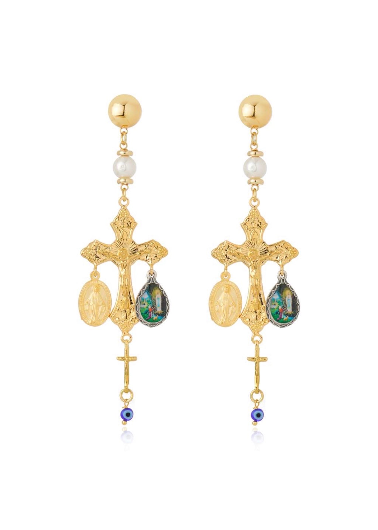 Stella Marie Earrings bring Italian Catholic charm to life with ornate crosses, saint charms, and pearl details. Bold, spiritual, and unapologetically stylish—perfect for making your faith fashionable