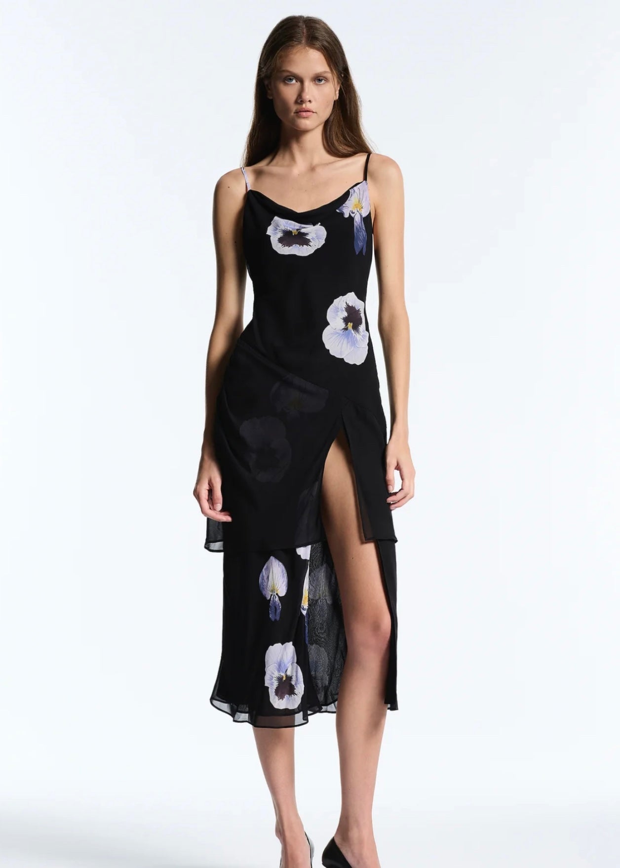 Effortlessly elegant, the Wisteria Midi Dress floats in luxurious Viscose Georgette with a beautifully layered, bias-cut silhouette that flatters every figure. Adjustable straps and a sweeping neckline create a soft, ethereal drape, while neutral tones with black accents keep things chic and versatile. Perfect for endless styling possibilities, this sophisticated piece transitions seamlessly from season to season with playful grace