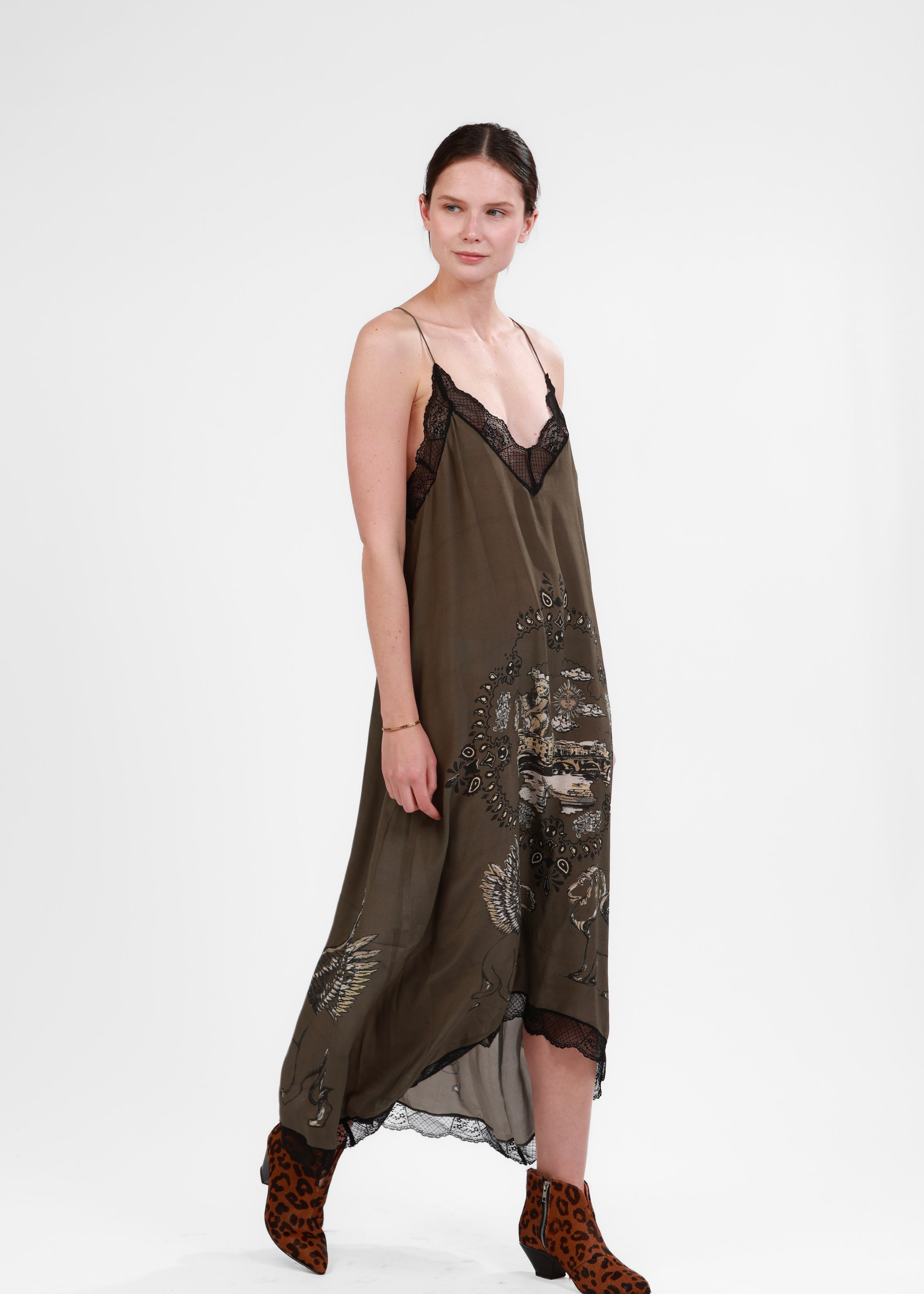 Expertly crafted from luxurious silk, our Zephyr Dress is a versatile addition to any wardrobe. The elegant midi length and adjustable straps make it perfect for any occasion, while the delicate black lace adds a touch of sophistication. Stay stylishly on-trend with the stunning green hue